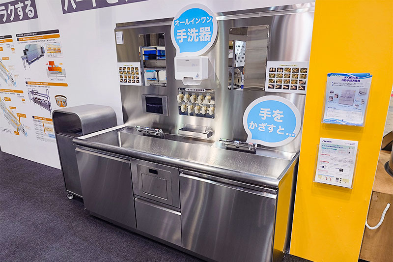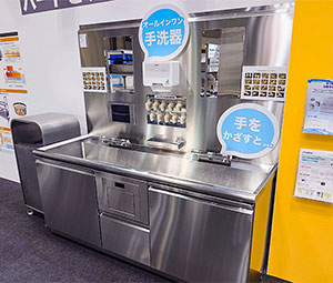 さらに「手洗いマニュアル」の動画を映し出すモニターを搭載し、誰でも正しい手洗いができるような新たな仕組みを展示しました。