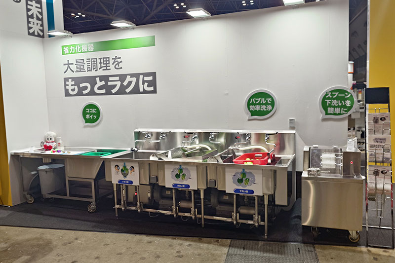 本展示会では、毎日の給油・廃油を自動化することで運搬にかかる負担、作業時の転倒、高温の油によるヤケドなどのリスクをZEROにする「食油タンクシステム (置き油)ZEROソリューション」と併せて展示しました。