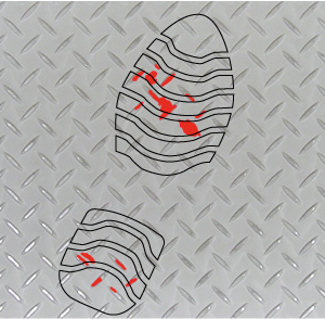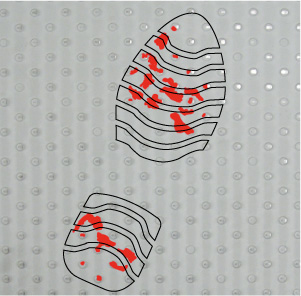 写真の赤い部分は、安全靴でポルカプレート®とチェッカープレートを踏んだ時の接地状態です。ポルカプレート®は接地面積が大きいため、床材として使用した場合、足にかかる負担を大幅に軽減し、足裏の痛みもありません。